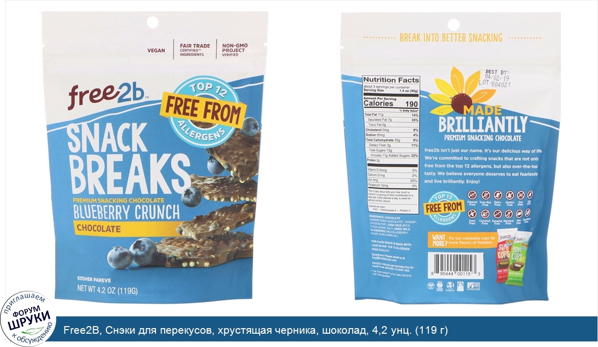 Друзья, если у вас есть отзыв/дополнение/комментарий/вопрос относительно Free2B, Снэки для перекусов, хрустящая черника, шоколад, 4,2 унц. (119 г) - напишите его ответом в эту тему (это будет полезно всему сообществу в целом и вам в отдельности).