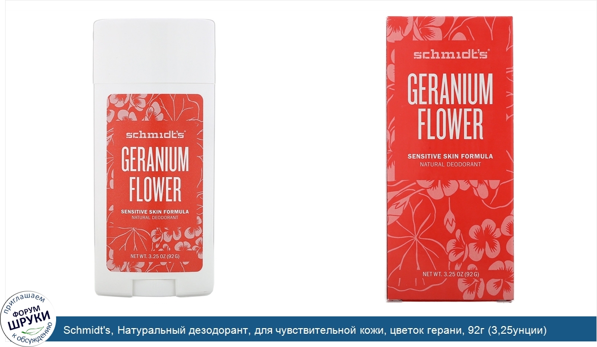 Schmidt\'s, Натуральный дезодорант, для чувствительной кожи, цветок герани, 92г (3,25унции)