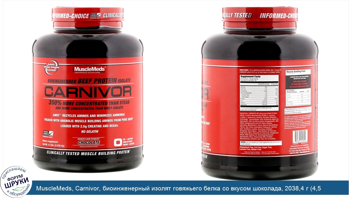 [DESCRIPT]Anabolic Nitrogen Retention Technology (технология анаболического отложения азота). Технологии для повышения работоспособности. На 350% более концентрированный, чем бифштекс. И более концентрированный, чем сывороточный изолят. Технология ANRT™ позволяет перерабатывать аминокислоты и минимизировать количество аммиака. Содержит большое количество аминокислот для наращивания мышечной массы из чистой говядины. Содержит 2,5 г креатина и аминокислоты с разветвленной цепью. Не содержит желатина. Informed-Choice.Org — выбор спортсменов. Пищевая добавка. Усовершенствованная вкусовая технология. Натуральные и искусственные ароматизаторы. Не содержит жиров, лактозы, холестерина, сахара и глютена. Белок для наращивания мышечной массы, прошедший клинические испытания+. Нарастите мышцы с Carnivor — «лучшим в мире изолятом говяжьего белка». Давно известно, что бодибилдеры и спортсмены в силовых видах спорта потребляют большое количество говядины для набора мышечной массы и улучшения силовых показателей. Эффективность употребления говядины для наращивания мышечной массы бесспорна. Спросите любого бодибилдера — и он скажет вам, что он набирает больше всего мышечной массы и чувствует себя намного сильнее, когда ест говядину. Теперь, благодаря разработке передового биоинженерного говяжьего белка, MuscleMeds создал высокоанаболический белок для наращивания мышечной массы. Carnivor не похож ни на какие другие белковые добавки. Эффективность набора мышечной массы с Carnivor подтверждена клиническими исследованиями. Благодаря использованию передовых технологий экстракции, гидролиза и выделения изолят говяжьего белка от Carnivor обеспечивает характерную для говядины эффективность набора мышечной массы с более высоким содержанием аминокислот, чем в других источниках белка, включая сыворотку, сою, молоко и яйца. Концентрация анаболических аминокислот в Carnivor BPI на 350% выше, чем в бифштексе из лучшей вырезки! Кроме того, эффективность набора мышечной массы и улучшения силовых показателей благодаря Carnivor подтверждена наукой. Клинические исследования показывают, что мужчины, занимавшиеся тяжелыми силовыми тренировками и принимавшие добавки Carnivor BPI, набрали в среднем 7,7 фунта мышечной массы всего за 8 недель, со средним увеличением мышечной массы тела на 6,4 %, в то время как группа, принимавшая плацебо, увеличила мышечную массу всего на 0,7 фунта по отношению к исходному уровню. Исследование также показало, что спортсмены (мужчины и женщины), которые принимали Carnivor BPI, увеличили общие показатели жима лежа и становой тяги за 1 повтор на 147,7 фунта, в то время как группа, принимавшая плацебо, увеличила общие силовые показатели только на 82,6 фунта по отношению к исходному уровню. Помимо прочего, эти впечатляющие открытия подтверждают эффективность продуктов Carnivor для увеличения мышечной массы и улучшения силовой подготовки. Anabolic Nitrogen Retention Technology™ — ANRT (технология анаболического отложения азота) позволяет перерабатывать аминокислоты и минимизировать количество аммиака. Технология анаболического удержания азота (Anabolic Nitrogen Retention Technology, ANRT) — существенный прорыв в разработке белковых добавок для набора мышечной массы. Сывороточный белок имеет решающее значение для роста мышц, иногда он может фактически снижать спортивные результаты и рост мышц, если продукты с азотистыми шлаками, так