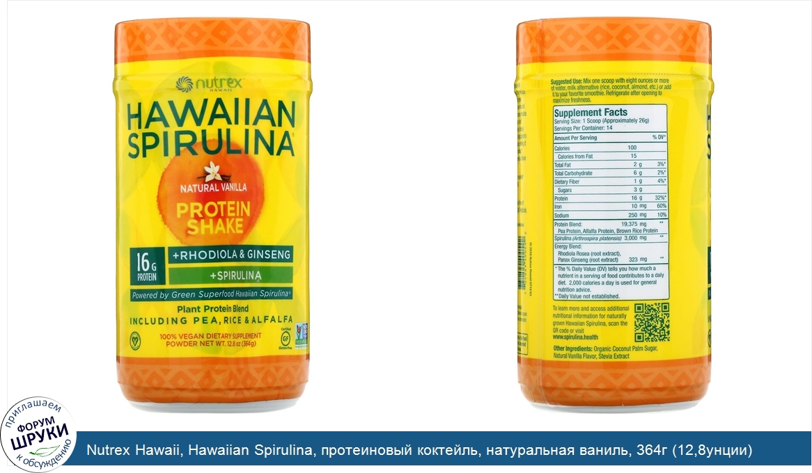 Друзья, если у вас есть отзыв/дополнение/комментарий/вопрос относительно Nutrex Hawaii, Hawaiian Spirulina, протеиновый коктейль, натуральная ваниль, 364г (12,8унции) - напишите его ответом в эту тему (это будет полезно всему сообществу в целом и вам в отдельности).