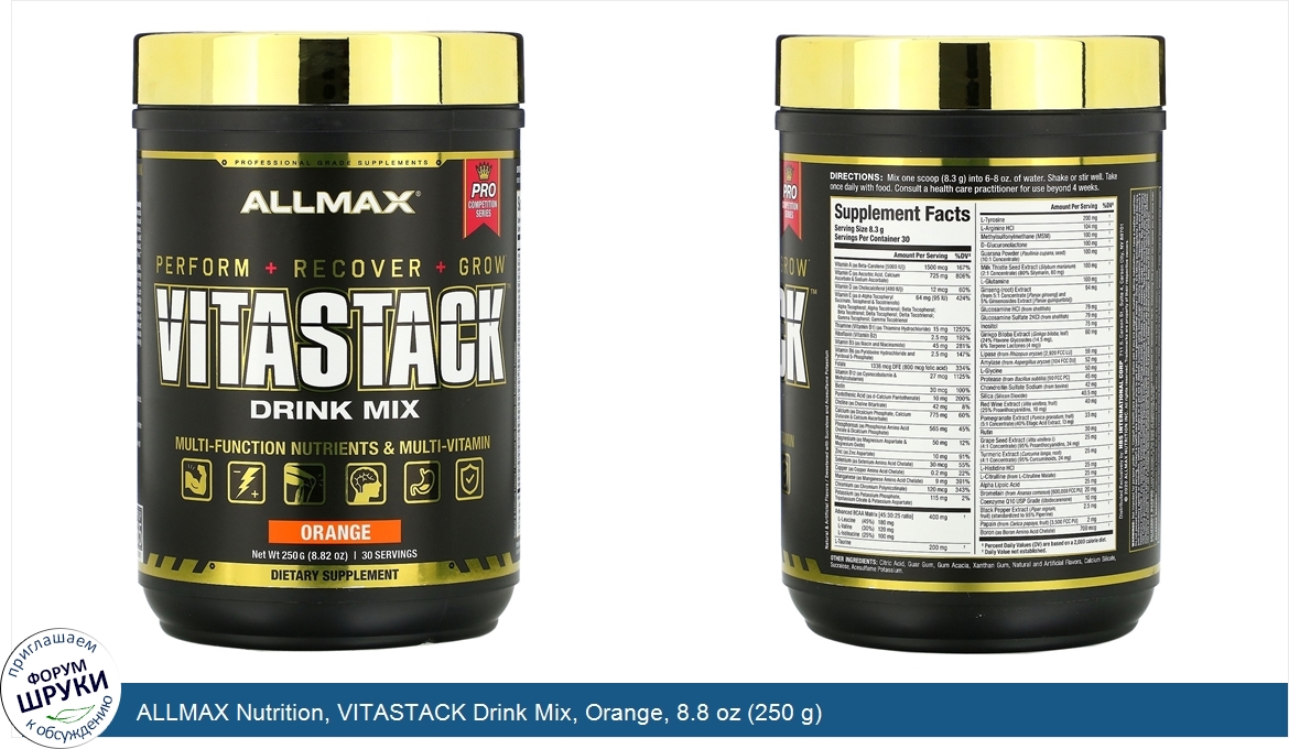 [DESCRIPT]Professional Grade Supplements. Pro Competition Series. Perform + Recover + Grow. Multi-Function Nutrients Multi-Vitamin. Dietary Supplement. Natural and Artificial Flavors. Sweetened with Sucralose and Acesulfame Potassium. CGMP Registered Facility. Lab Tested. The Ultimate Performance Drink. . Why add nutritional supplementation to a healthy diet already supported by sports nutrition? Excessive physiological demands from intense training and strict dieting could create nutritional deficiencies which adversely impact overall athletic performance. Knowledgeable, hard-working athletes understand that with a solid nutritional foundation, sports nutrition can be better maximized, resulting in a higher level of performance on a more consistent basis. Why use ALLMAX VITASTACK? No dyes, gelatin caps, glues, binders, or fillers of any kind. Just pure performance and recovery ingredients. All athletes, professional or amateur, require more sustenance than what traditional multi-vitamins can provide. Each VITASTACK serving contains a specially formulated, powerfully potent blend of over 70 highly active and ultra-absorbable nutrients: vitamins, minerals, BCAAs, phytonutrients, enzymes antioxidants. Backed by clinical and sports research, every nutrient is optimally dosed to deliver on the physiological demands associated with muscle growth and performance in high-intensity athletic training. Easy-To-Use, Great Taste Cost Effective. Stirs in and mixes easily: Dissolves quickly with no clumping. Refreshing Taste: Bursting with tangy citrus flavor. Saves money: Avoids upfront purchase of multiple different products. Perfect for All Athletes. Builds strong nutritional foundation which sports nutrition can better springboard from. Supports demands from intense training including strength, weight and endurance programs. Fills potential gaps created by strict dieting.[/DESCRIPT]... (описание дополняется)