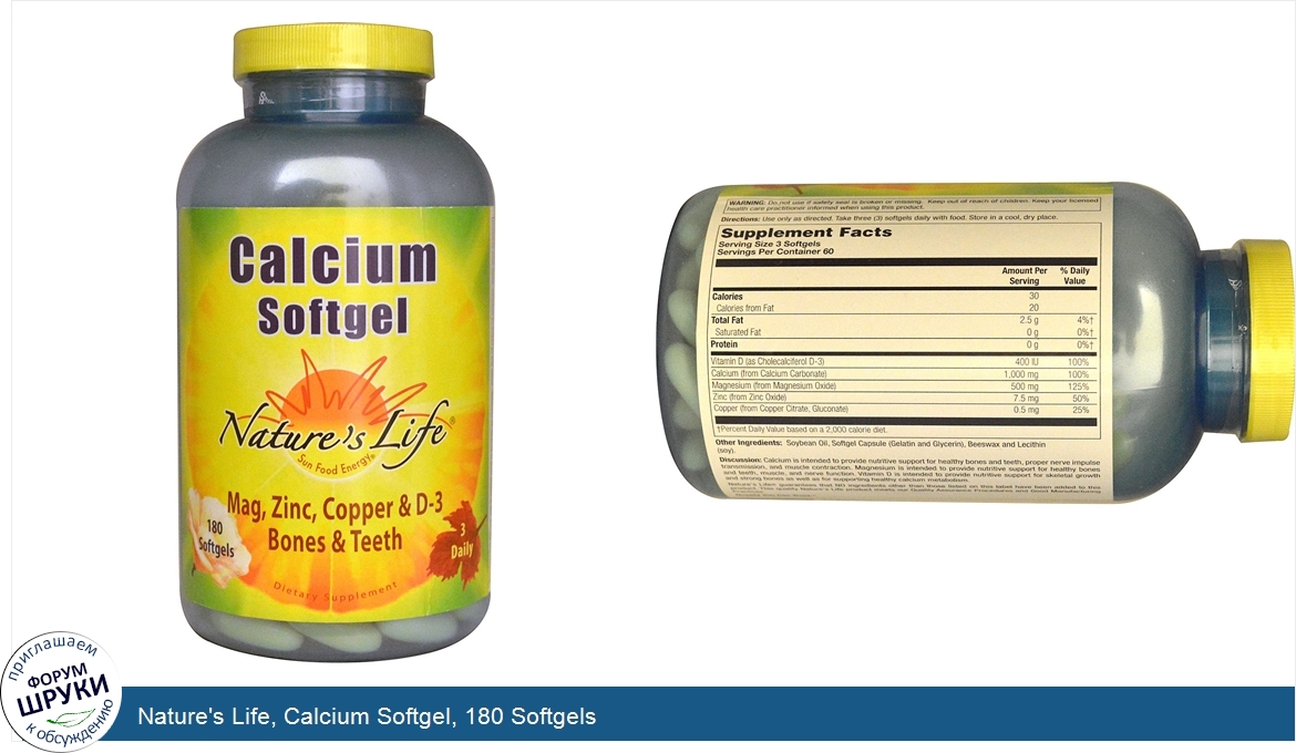 Друзья, если у вас есть отзыв/дополнение/комментарий/вопрос относительно Nature's Life, Calcium Softgel, 180 Softgels - напишите его ответом в эту тему (это будет полезно всему сообществу в целом и вам в отдельности).