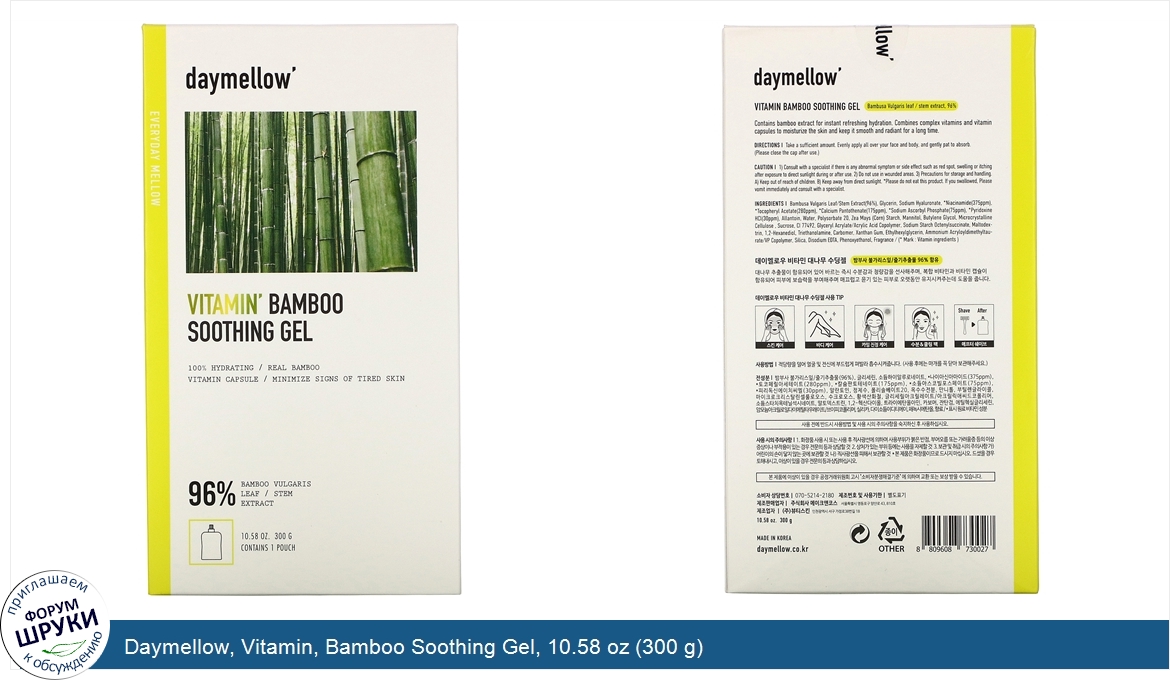 Друзья, если у вас есть отзыв/дополнение/комментарий/вопрос относительно Daymellow, Vitamin, Bamboo Soothing Gel, 10.58 oz (300 g) - напишите его ответом в эту тему (это будет полезно всему сообществу в целом и вам в отдельности).