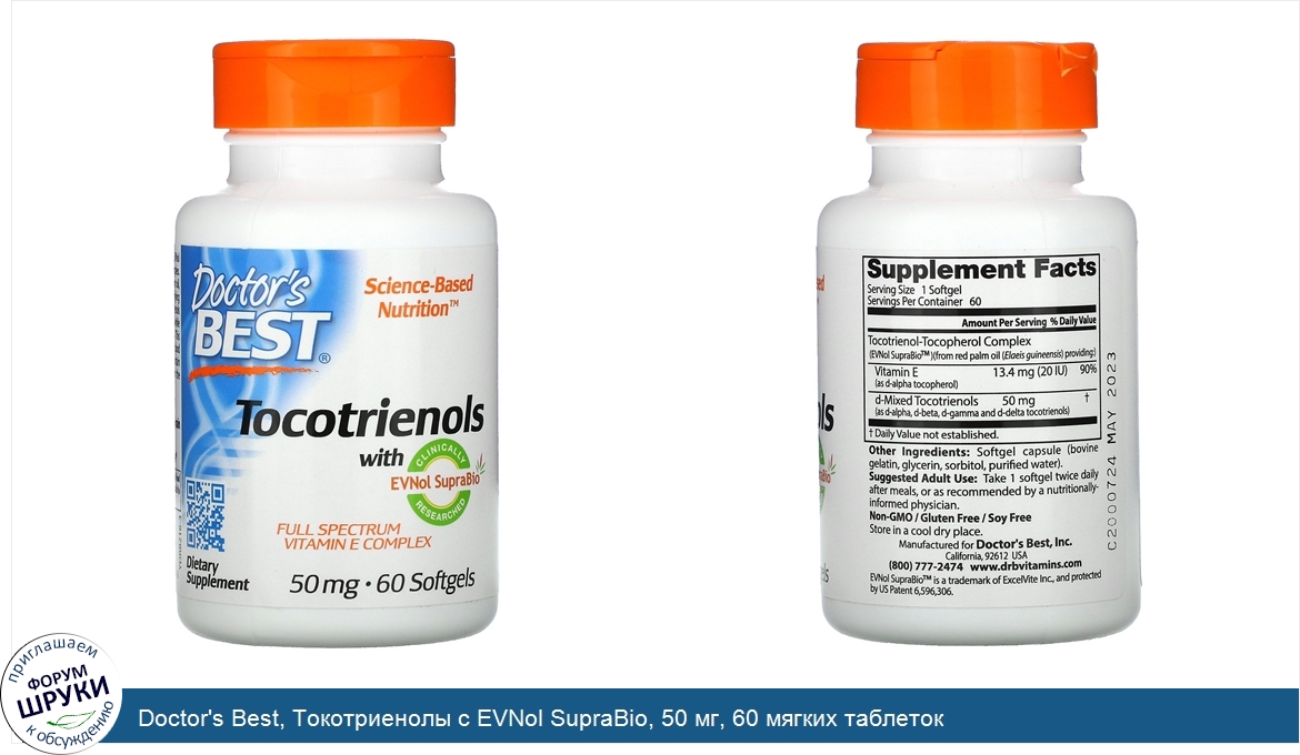 Science-Based Nutrition™. С клинически исследованным препаратом EVNol SupraBio. Комплекс витамина E полного спектра. Пищевая добавка. Не содержит ГМО / не содержит глютена / не содержит сои. Токотриенолы от Docto...