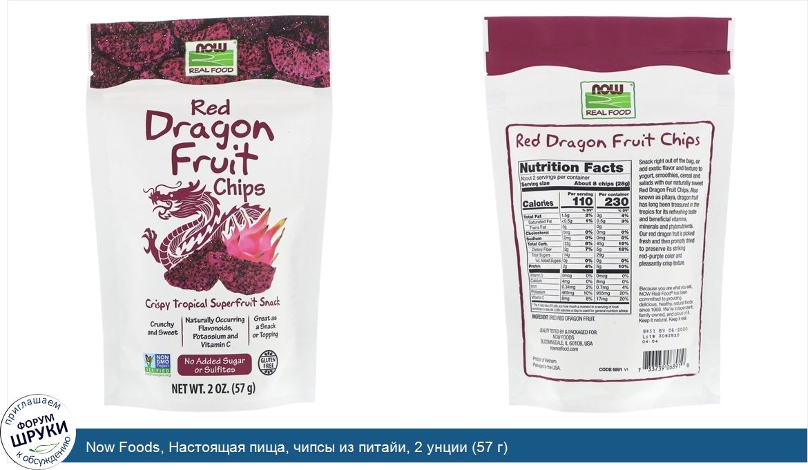 [DESCRIPT]Crispy Tropical Superfruit Snack. Crunchy and Sweet. Naturally Occurring Flavonoids, Potassium and Vitamin C. Great as a Snack or Topping. Non-GMO Project Verified. No Added Sugar or Sulfites. Gluten Free. Snack right out of the bag, or add exotic flavor and texture to yogurt, smoothies, cereal and salads with our naturally sweet Red Dragon Fruit Chips. Also known as pitaya, dragon fruit has long been treasured in the topics for its refreshing taste and beneficial vitamins, minerals and phytonutrients. Our red dragon fruit is picked fresh and then promptly dried to preserve its striking red-purple color and pleasantly crisp texture. Because you are what you eat, Now Real Food has been committed to providing delicious, healthy, natural foods since 1968. We're independent, family owned, and proud of it. Keep it natural. Keep it real.[/DESCRIPT]... (описание дополняется)