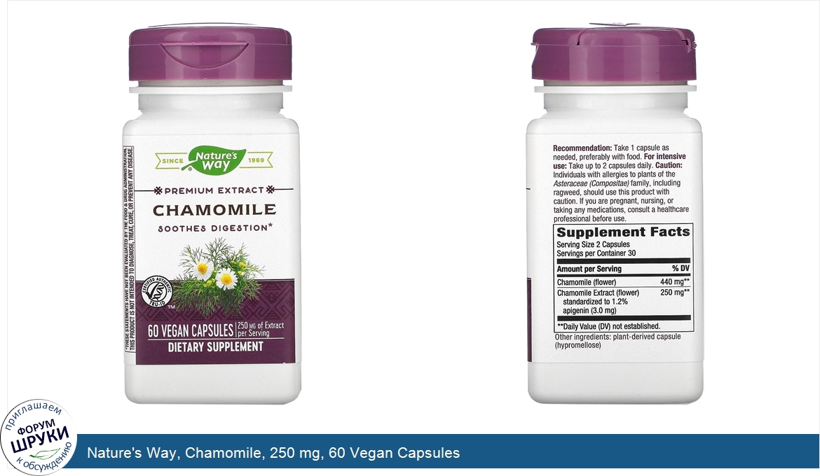 Друзья, если у вас есть отзыв/дополнение/комментарий/вопрос относительно Nature's Way, Chamomile, 250 mg, 60 Vegan Capsules - напишите его ответом в эту тему (это будет полезно всему сообществу в целом и вам в отдельности).