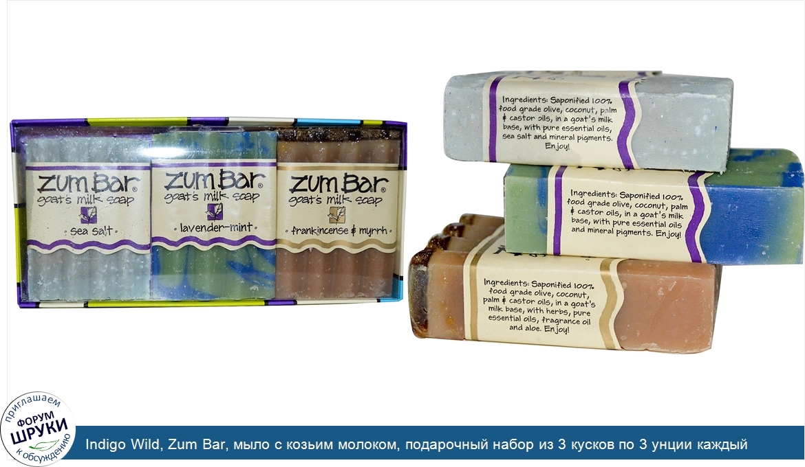 Друзья, если у вас есть отзыв/дополнение/комментарий/вопрос относительно Indigo Wild, Zum Bar, мыло с козьим молоком, подарочный набор из 3 кусков по 3 унции каждый - напишите его ответом в эту тему (это будет полезно всему сообществу в целом и вам в отдельности).