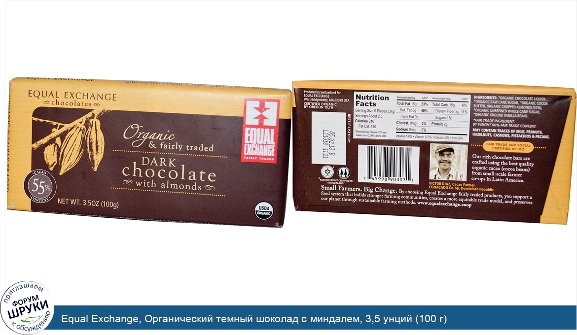 Друзья, если у вас есть отзыв/дополнение/комментарий/вопрос относительно Equal Exchange, Органический темный шоколад с миндалем, 3,5 унций (100 г) - напишите его ответом в эту тему (это будет полезно всему сообществу в целом и вам в отдельности).