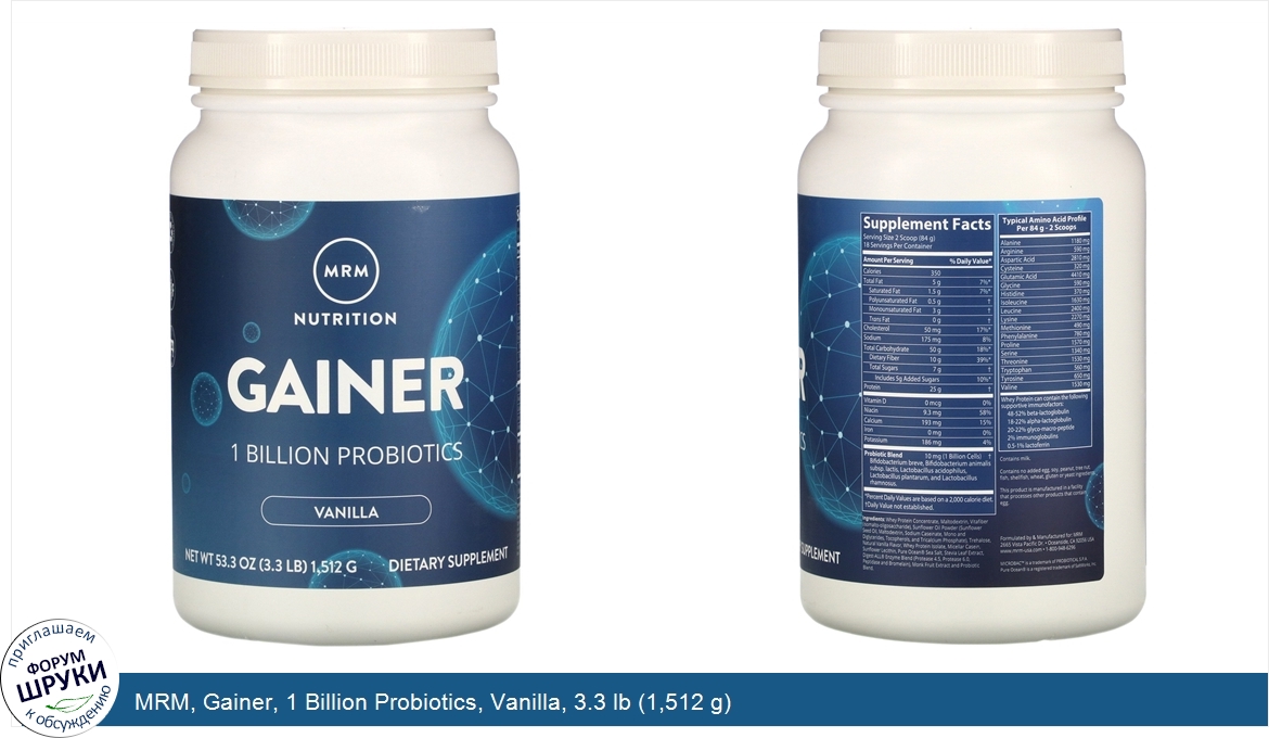 MRM, Gainer, 1 Billion Probiotics, Vanilla, 3.3 lb (1,512 g)