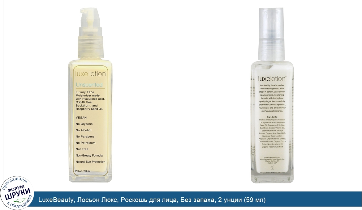 Друзья, если у вас есть отзыв/дополнение/комментарий/вопрос относительно LuxeBeauty, Лосьон Люкс, Роскошь для лица, Без запаха, 2 унции (59 мл) - напишите его ответом в эту тему (это будет полезно всему сообществу в целом и вам в отдельности).