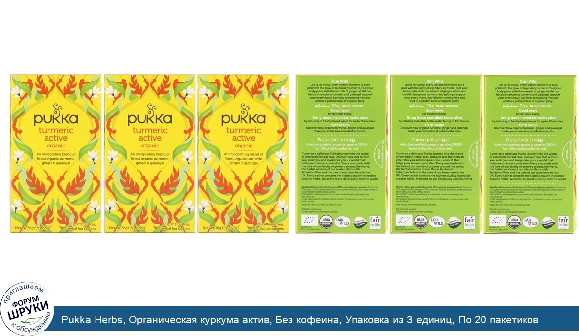 [DESCRIPT]Certified Organic by Soil Association Certification. USDA Organic. FairWild. Organic is Non GMO. Fair for Life - Fair Trade. Kosher. Naturally Caffeine-Free and Ethically Sourced. An invigorating blend of finest organic turmeric, ginger galangal. Run Wild. Life is for living. Every vibrant moment is pure gold with the glow of legendary turmeric. Feel your body pulse with the warmth of ginger whilst our herbal champions turmeric and galangal support you every move. Say hello to running free and wild in a golden blaze of organic glory. Good News for dynamic living. Puk-ka - Adjective: excellent, proper or genuine. Origin from Hindi pakka: authentic, real. Come on a delicious Pukka journey into the world of incredible herbal teas. Discover teas that refresh you, relax you and invigorate you - a world that helps your senses come alive. Every one made with the love of our family of growers around the world, the herbal wisdom of our Master Herbsmith Sebastian Pole and the care of our team here in the UK. Every sachet contains the highest quality incredible organic herbs. Welcome to our deliciously colorful world. Naturally made, with care. This lovely design is printed with vegetable ink on card from renewable sources and is recyclable; the string on each bag is organic; and because we don't staple our bags, they're wildlife friendly to compost. Add to that 100% non-GM ingredients, and you have incredible tasting tea that's good for you, as well as the planet.[/DESCRIPT]... (описание дополняется)