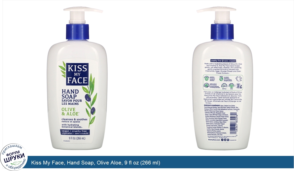 [DESCRIPT]Cleanses Soothes. With Hydrating Botanical Blends. ™. Vegan. Cruelty Free. Our Recipe: No Parabens/Phthalates. Vegan - No Animal Ingredients. Ethical Sourcing. BPA Free. Made with a hydrating blend of Olive Oil, Aloe and Vitamin E, Kiss My Face Hand Soaps gently, yet effectively, cleanse. This soothing, gently scented formula is infused with Chamomile, Sage, Orange Flower and Elder Flower Extracts.[/DESCRIPT]... (описание дополняется)