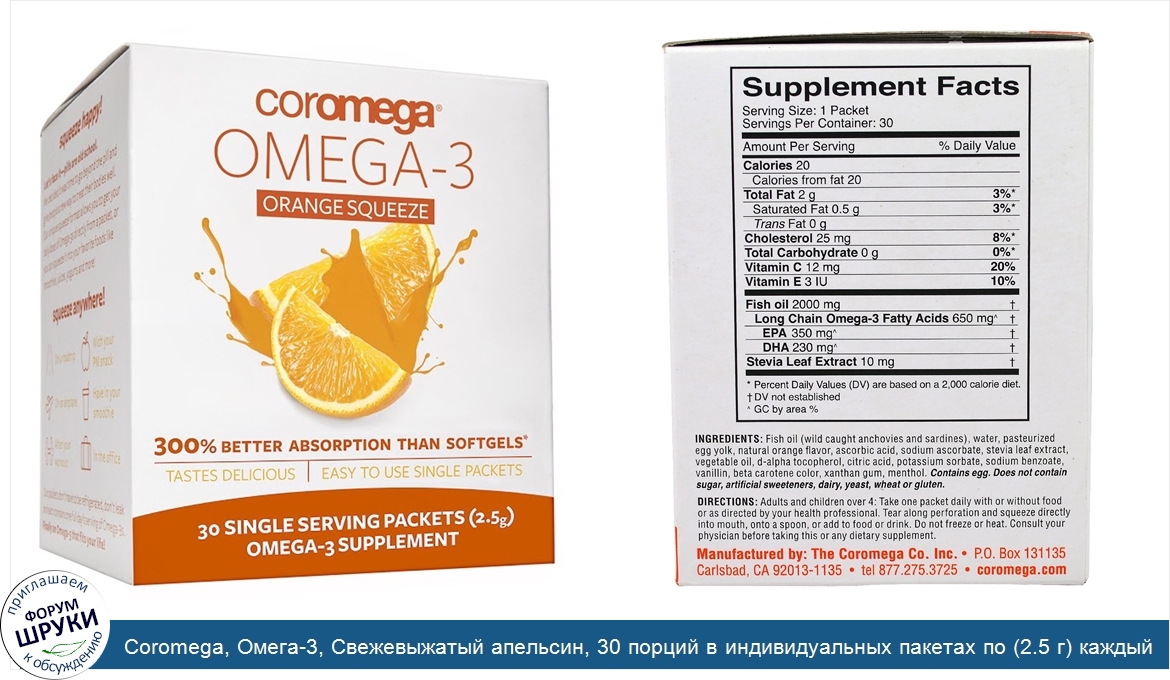 Coromega, Омега-3, Свежевыжатый апельсин, 30 порций в индивидуальных пакетах по (2.5 г) каждый