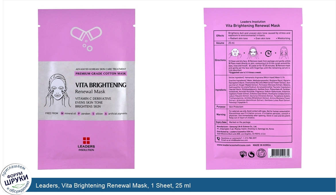 Друзья, если у вас есть отзыв/дополнение/комментарий/вопрос относительно Leaders, Vita Brightening Renewal Mask, 1 Sheet, 25 ml - напишите его ответом в эту тему (это будет полезно всему сообществу в целом и вам в отдельности).