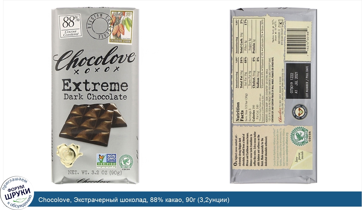 Друзья, если у вас есть отзыв/дополнение/комментарий/вопрос относительно Chocolove, Экстрачерный шоколад, 88% какао, 90г (3,2унции) - напишите его ответом в эту тему (это будет полезно всему сообществу в целом и вам в отдельности).