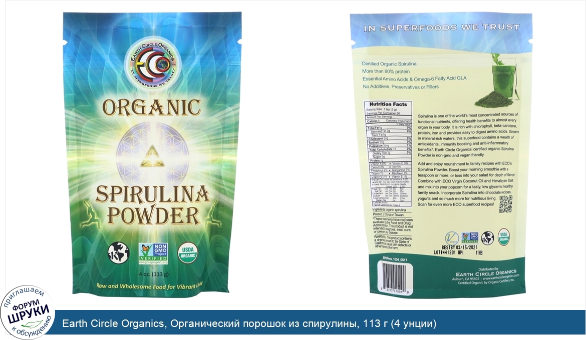Друзья, если у вас есть отзыв/дополнение/комментарий/вопрос относительно Earth Circle Organics, Органический порошок из спирулины, 113 г (4 унции) - напишите его ответом в эту тему (это будет полезно всему сообществу в целом и вам в отдельности).