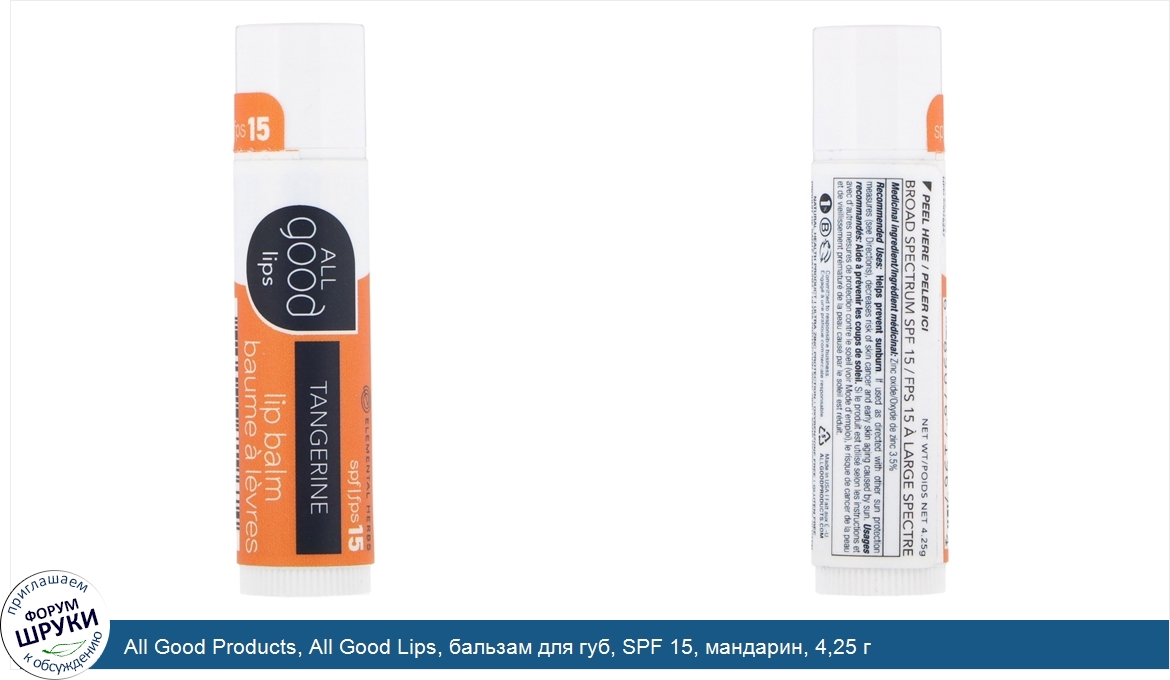 All Good Products, All Good Lips, бальзам для губ, SPF 15, мандарин, 4,25 г