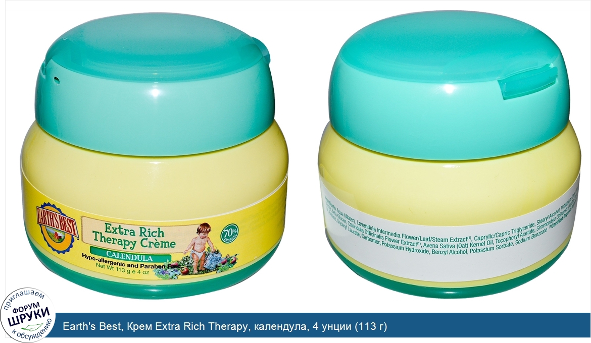 Друзья, если у вас есть отзыв/дополнение/комментарий/вопрос относительно Earth's Best, Крем Extra Rich Therapy, календула, 4 унции (113 г) - напишите его ответом в эту тему (это будет полезно всему сообществу в целом и вам в отдельности).