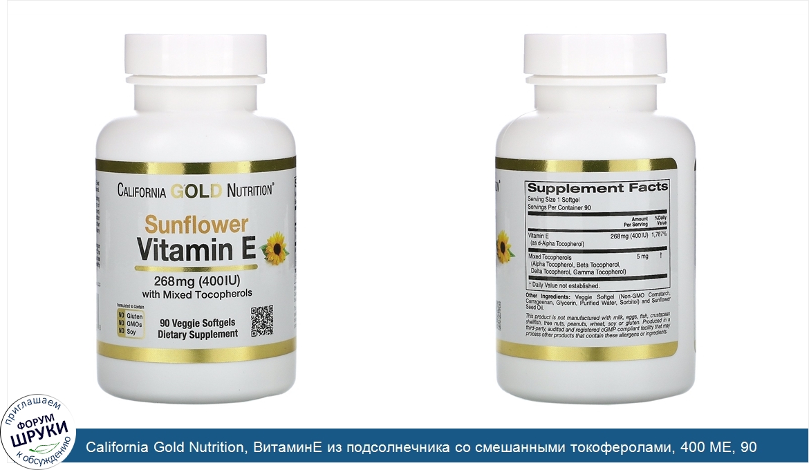. Витамин E из подсолнечника. California Gold Nutrition. Со смешанными токоферолами: альфа-, бета-, дельта- и гамма-. Натуральный антиоксидант из подсолнечника. Обеспечивает защиту от воздействия свободных радика...