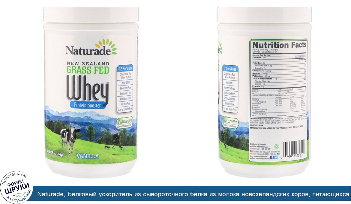 [DESCRIPT]12 Servings. 20 g Grass Fed Whey Protein. Non-GMO. Hormone Free. Pesticide Free. Antibiotic Free. Gluten Free. Soy and Grain Free. Naturally Flavored Sweetened. Naturade New Zealand Grass Fed Whey Protein. is a wholesome, high quality, traceable source of all-natural grass fed whey protein derived from milk collected from cows that are grass fed year-round on natural New Zealand pastures that are free of pesticides and chemicals. The cows are never fed any genetically modified organisms, and they are not exposed to growth hormone treatment (rBGH rBST), chemicals, antibiotics, or injected pathogens. Whey protein sourced from grass fed cows is also higher in immune factors (Immunoglobulins, Lactoferrin and Serum Albumin) than whey protein sourced from non-grass fed cows. Naturade. uses unique cold ultra-filtration membrane technology which involves minimal processing to extract the protein, ensuring that the whey is not subjected to unsafe temperatures that would destroy the original protein components. Our grass fed whey is not hydrolyzed, cross-flow filtered, or ion exchanged - all methods that denature the original proteins and compromise the nutritional value and purity. This product is also free of high fructose corn syrup, artificial sweeteners, flavors or colors, GMO ingredients, non-dairy creamer, soy, grain or gluten. Always delicious, always pure, always natural! This product is a great source of dietary fiber and is fortified with digestive enzymes for maximum absorption and bio-availability. Each delicious shake provides 20 grams of pure whey protein, 5 grams of dietary fiber and a complete amino acid profile for optimum health. Naturade - your partner in good health![/DESCRIPT]... (описание дополняется)