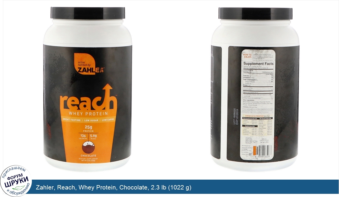Great-Tasting. Low Sugar. Low Carbs. 25 g Protein. 136 Calories. 5.6 g BCAAs. Dietary Supplement. Kosher Dairy. Reach. Zahler's Active Nutrition Line. Restores Energy and Cuts Hunger. With Reach, You'll Eat Bette...