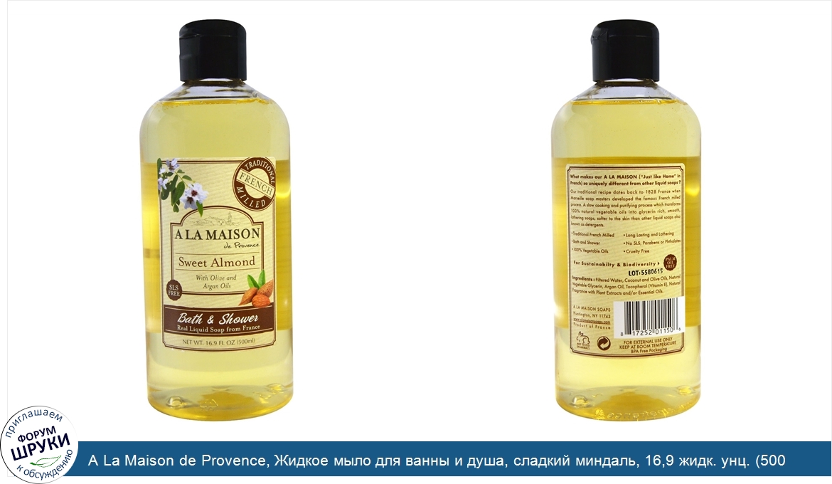 Друзья, если у вас есть отзыв/дополнение/комментарий/вопрос относительно A La Maison de Provence, Жидкое мыло для ванны и душа, сладкий миндаль, 16,9 жидк. унц. (500 мл) - напишите его ответом в эту тему (это будет полезно всему сообществу в целом и вам в отдельности).