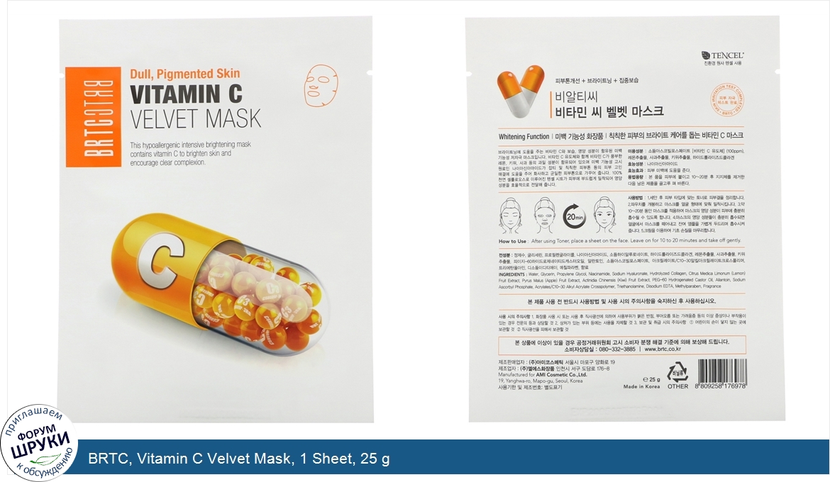 BRTC, Vitamin C Velvet Mask, 1 Sheet, 25 g