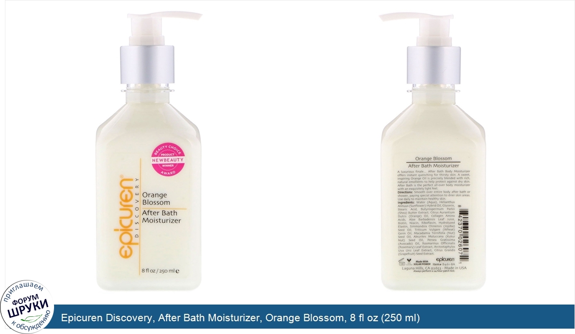 Друзья, если у вас есть отзыв/дополнение/комментарий/вопрос относительно Epicuren Discovery, After Bath Moisturizer, Orange Blossom, 8 fl oz (250 ml) - напишите его ответом в эту тему (это будет полезно всему сообществу в целом и вам в отдельности).