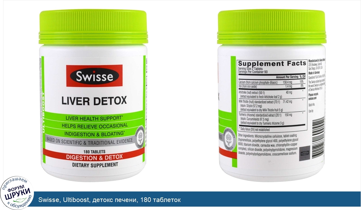 [DESCRIPT]Digestion Detox. Liver Health Support. Helps Relieve Occasional. Indigestion Bloating. Based on Scientific Traditional Evidence. Premium Quality Formula. Dietary Supplement. Benefits: Swisse Ultiboost Liver Detox is a premium quality formula containing herbs traditionally used to help support liver function and provide relief from occasional indigestion and bloating. Detoxification: The liver is responsible for eliminating toxins by playing a central role in the metabolism of substances, helping with their removal from the body. Swisse Ultiboost Liver Detox contains milk thistle, traditionally used in Western Herbal Medicine as a liver tonic to help support liver health and function. A healthy liver supports the detoxification process. Indigestion: Contains turmeric and artichoke, which have been traditionally used in Western Herbal Medicine to help relieve occasional indigestion. Bloating Cramping: Artichoke has traditionally been used in Western Herbal Medicine to help relieve digestive symptoms such as flatulence, abdominal bloating and cramping. Antioxidant Support: Milk thistle and turmeric have antioxidant properties to help combat potential free radical damage. Swisse Ultiboost Liver Detox has been formulated based on scientific and traditional evidence to take as part of a healthy detox or following rich food or drinks.[/DESCRIPT]... (описание дополняется)