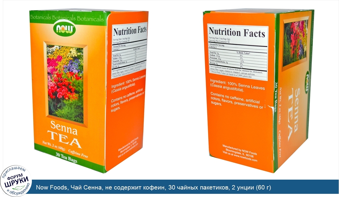 Друзья, если у вас есть отзыв/дополнение/комментарий/вопрос относительно Now Foods, Чай Сенна, не содержит кофеин, 30 чайных пакетиков, 2 унции (60 г) - напишите его ответом в эту тему (это будет полезно всему сообществу в целом и вам в отдельности).