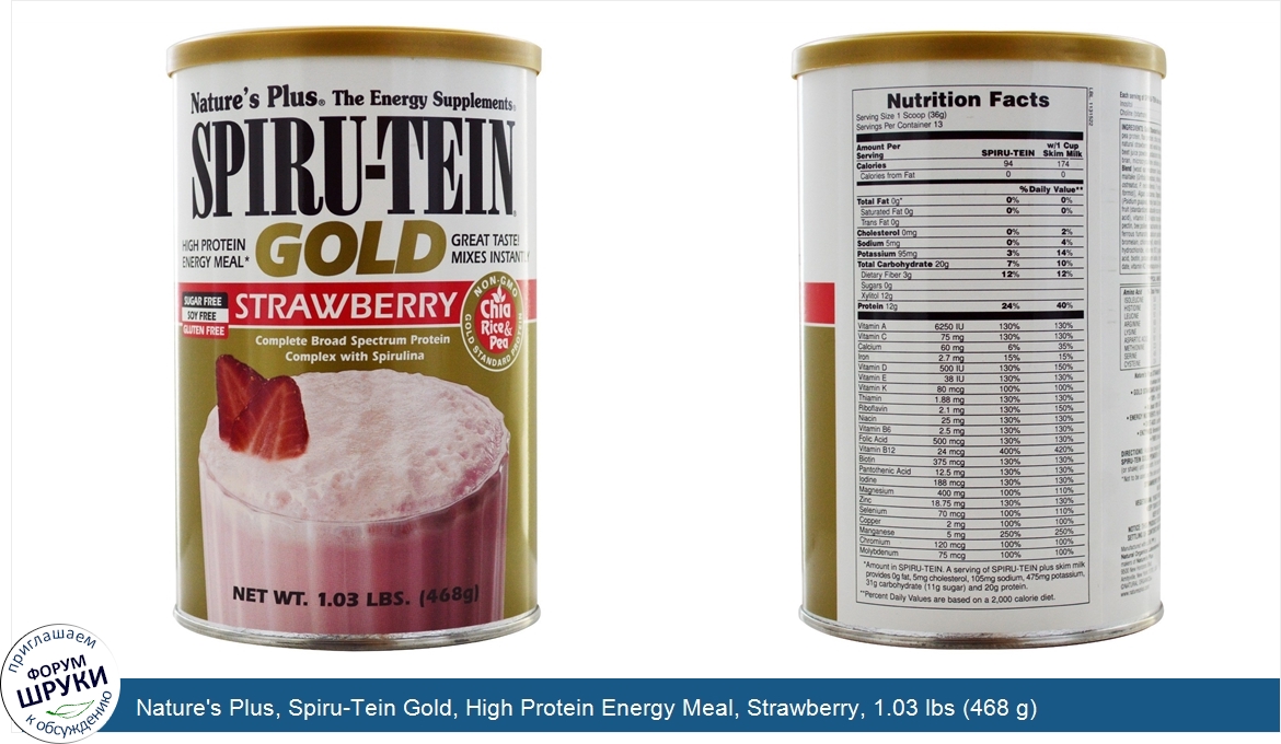 [DESCRIPT]The Energy Supplements. High Protein Energy Meal*. Sugar Free. Soy Free. Gluten Free. Great Taste! . Mixes Instantly. Complete Broad Spectrum Protein Complex with Spirulina. Non-GMO. Chia Rice Pea. Gold Standard Protein. Vegetarian, Yeast-Free Product. No limits. No boundaries. Get ready for your life to soar! Spiru-Tein Gold is designed to meet today's relentless energy demands and give you the steady spark you need to keep going. Spiru-Tein Gold supplies 12 grams of complete protein derived from nature's premier soy-free vegetarian sources - chia protein, rice protein, pea protein and flax protein - a wellspring of energy! Fused with 130% of the Daily Value of vitamins, 100% of the Daily Value of minerals, energy nutrients, organic whole foods, diet aids, enzymes, cleansing nutrients and fiber, Spiru-Tein Gold is the world's most complete soy-free, sugar-free, high-protein energy meal. Nature's Plus Strawberry Spiru-Tein Gold Powder features a unique blend of ingredients, including. Gold Standard Non-GMO Protein Blend: Chia, Rice, Pea, Flax. 100% -130% Daily Value of all Vitamins. At least 100% Daily Value of Essential Minerals. Energy Nutrients: High Quality Gold Standard Protein and Bee Pollen. Diet-Aids: Lecithin, Spirulina, Choline and Inositol. Enzymes: Bromelain and Papaya. Cleansing: Chlorophyll. Fiber: Bran, Cellulose and Apple Pectin. *Not to be used as the sole source of dietary calories.[/DESCRIPT]... (описание дополняется)