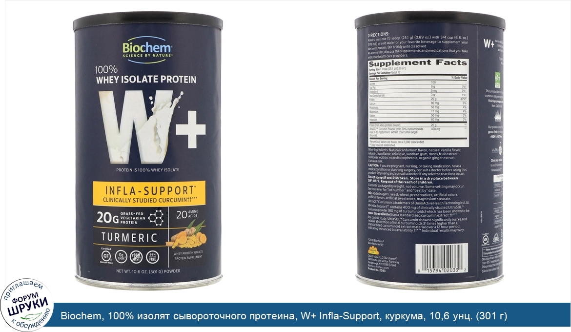[DESCRIPT]Science by Nature. Protein is 100% Whey Isolate. 20 g Grass-Fed Vegetarian Protein. 20 Amino Acids. Certified Gluten-Free. 0 g Sugar^. No rBGH / rBST†. 99% Lactose Free. Whey Protein Isolate Protein Supplement. AVA Certified Vegetarian - American Vegetarian Association. Kosher Dairy. Certified B Corporation. W+ is a new dual action protein line from Biochem that includes pure Whey Protein Isolate and novel functionality ingredients. Igen - Non-GMO Tested: This product does not contain common GE genes or proteins. A scoop of whey protein a day supports immune health. Grass-Fed: Our protein comes from grass-fed cows that are rBGH rBST free.†. Ultrafiltration/Microfiltration method results in 20 grams of pure whey protein. Ultrasol Curcumin: Clinically studied to be 31 times more bioavailable. ††. Like a delicious cup of golden milk. W+ Infla-Support contains 400 mg of clinically studied UltraSol curcumin powder (80 mg of curcuminoids) which has been shown to be more bioavailable than a standardized curcumin extract. ††. In a clinical study, UltraSol Curcumin showed significantly increased relative absorption of total curcuminoids 31 times higher than a standardized curcuminoids extract material over a 12 hour period, indicating enhanced bioavailability.†† Individual results may vary. 9 naturally occurring essential amino acids. , make this a complete protein. Histidine. Lysine. Threonine. Isoleucine. Methionine. Tryptophan. Leucine. Phenylalanine. Valine. +11 other amino acids. Alanine. Cysteine. Proline. Arginine. Glutamic Acid. Serine. Asparagine. Glutamine. Tyrosine. Aspartic Acid. Glycine. ^Not a low calorie food. †No significant difference has been shown between milk derived from rBST-treated and non-rBST treated cows.[/DESCRIPT]... (описание дополняется)
