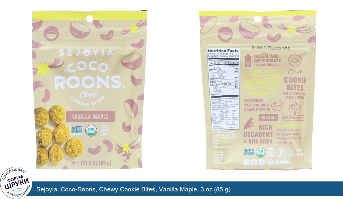 Друзья, если у вас есть отзыв/дополнение/комментарий/вопрос относительно Sejoyia, Coco-Roons, Chewy Cookie Bites, Vanilla Maple, 3 oz (85 g) - напишите его ответом в эту тему (это будет полезно всему сообществу в целом и вам в отдельности).