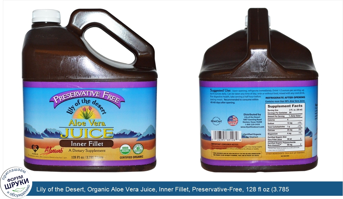 [DESCRIPT]Preservative Free. Kosher Pareve. Aloesorb. A Dietary Supplement. USDA Organic. Certified Aloe Content Purity in This Product - International Aloe Science Council. Certified Organic by OneCert. History of Aloe Vera. Originating. in Africa, aloe vera has enjoyed a long history of providing numerous health benefits. The earliest record of aloe vera was discovered on 4,000-year-old Sumerian clay tablets depicting its digestive benefits when taken internally. Aloe vera appears in Egyptian records for both whole-body health when taken internally and for refreshed skin when used as a topical. Even Cleopatra and Nefertiti both used aloe vera in their beauty treatments. Alexander the Great valued aloe vera so much that he conquered an island where aloe grew prolifically to help care for this troops. While. there are hundreds of species of aloe vera found around the world, the most common species use in aloe vera product is Aloe barbadensis Miller. This species thrives best in areas of Mexico, Texas, California and Florida where nutrient-rich soil can be found. Lily of the Desert takes pride in our motto of Retain in the Quality that Nature Created and continues the history of aloe vera and its benefits by bringing the best aloe vera product to you. Retaining the Quality that Nature Created. The aloe vera plant contains over 200 biologically active components. For over 40 years, Lily of the Desert has been the leader through its technology and innovation of providing the most efficacious and scientifically validated aloe vera products on the market. Naturally occurring high molecular weight aloe vera polysaccharides are isolated and then used to enhance the bio-availability of our regular strength aloe vera juice through a patent- pending process. Lily of the Desert aloe Vera Benefits. Helps support a healthy digestive system. Helps sustain and promote healthy regularity. Supports normal muscle and joint function. Preservative free. USDA Certified Organic. Recent Clinical Studies. of Lily of the Desert Product with Aloesorb demonstrated improved wellness benefits in healthy individuals such as: . Improved absorption of nutrients. Supported healthy Immune System. Enhance antioxidant support. Reduced toxic nitrate levels.[/DESCRIPT]... (описание дополняется)