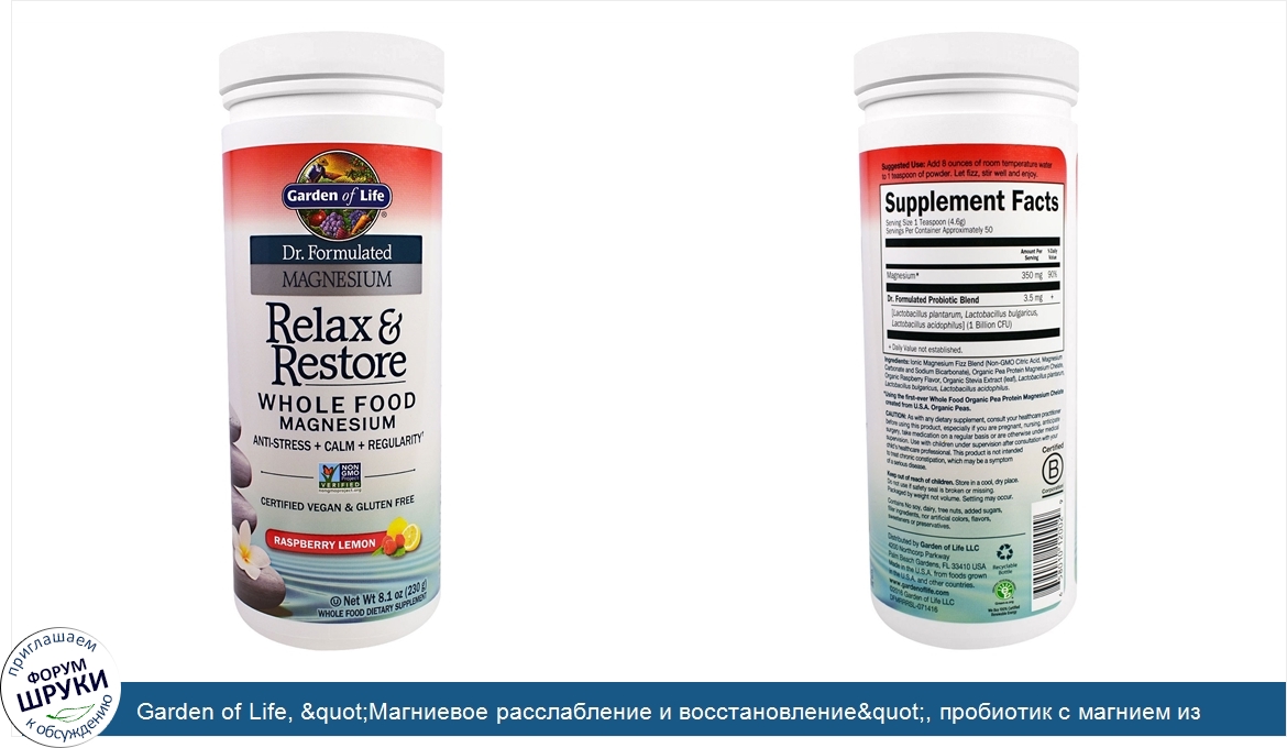 Друзья, если у вас есть отзыв/дополнение/комментарий/вопрос относительно Garden of Life, "Магниевое расслабление и восстановление", пробиотик с магнием из серии "Составлено врачом" с клубнично-лимонным вкусом, 8,1 унции (230 г) - напишите его ответом в эту тему (это будет полезно всему сообществу в целом и вам в отдельности).