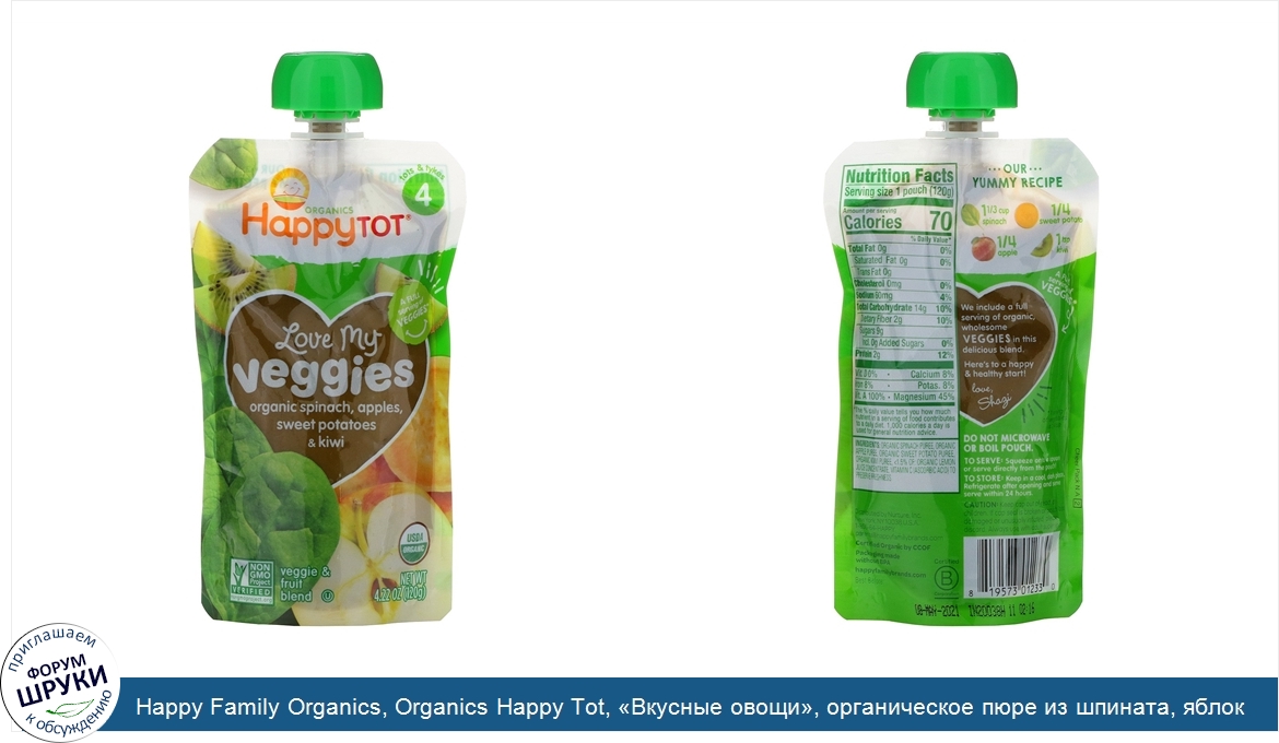 Друзья, если у вас есть отзыв/дополнение/комментарий/вопрос относительно Happy Family Organics, Organics Happy Tot, «Вкусные овощи», органическое пюре из шпината, яблок, батата и киви, 120г - напишите его ответом в эту тему (это будет полезно всему сообществу в целом и вам в отдельности).