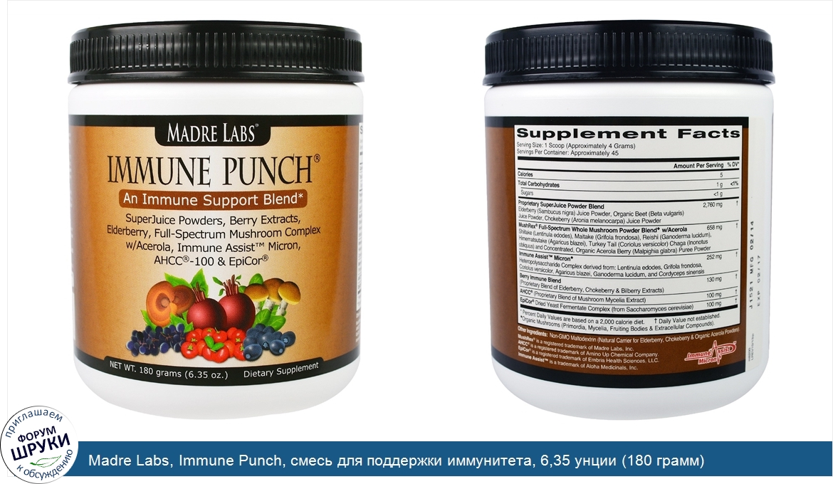 Друзья, если у вас есть отзыв/дополнение/комментарий/вопрос относительно Madre Labs, Immune Punch, смесь для поддержки иммунитета, 6,35 унции (180 грамм) - напишите его ответом в эту тему (это будет полезно всему сообществу в целом и вам в отдельности).