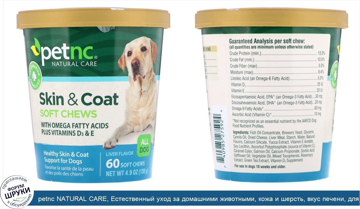 Друзья, если у вас есть отзыв/дополнение/комментарий/вопрос относительно petnc NATURAL CARE, Естественный уход за домашними животными, кожа и шерсть, вкус печени, для всех собак, 60 жевательных пастилок - напишите его ответом в эту тему (это будет полезно всему сообществу в целом и вам в отдельности).