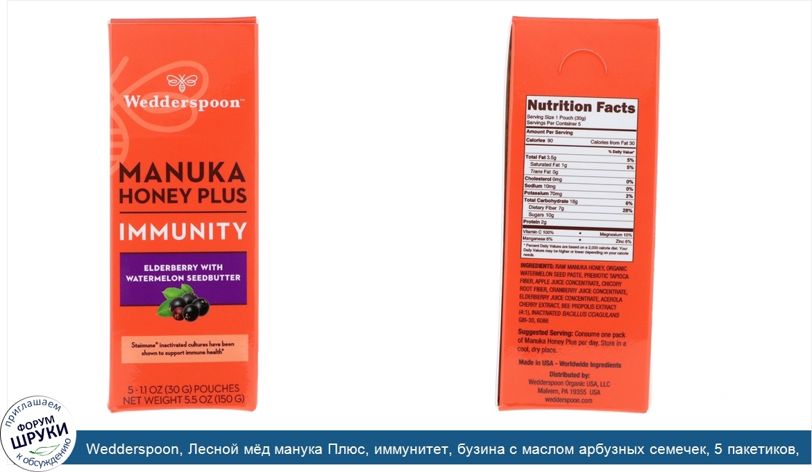 Wedderspoon, Лесной мёд манука Плюс, иммунитет, бузина с маслом арбузных семечек, 5 пакетиков, 1,1 унц. (30 г) каждый