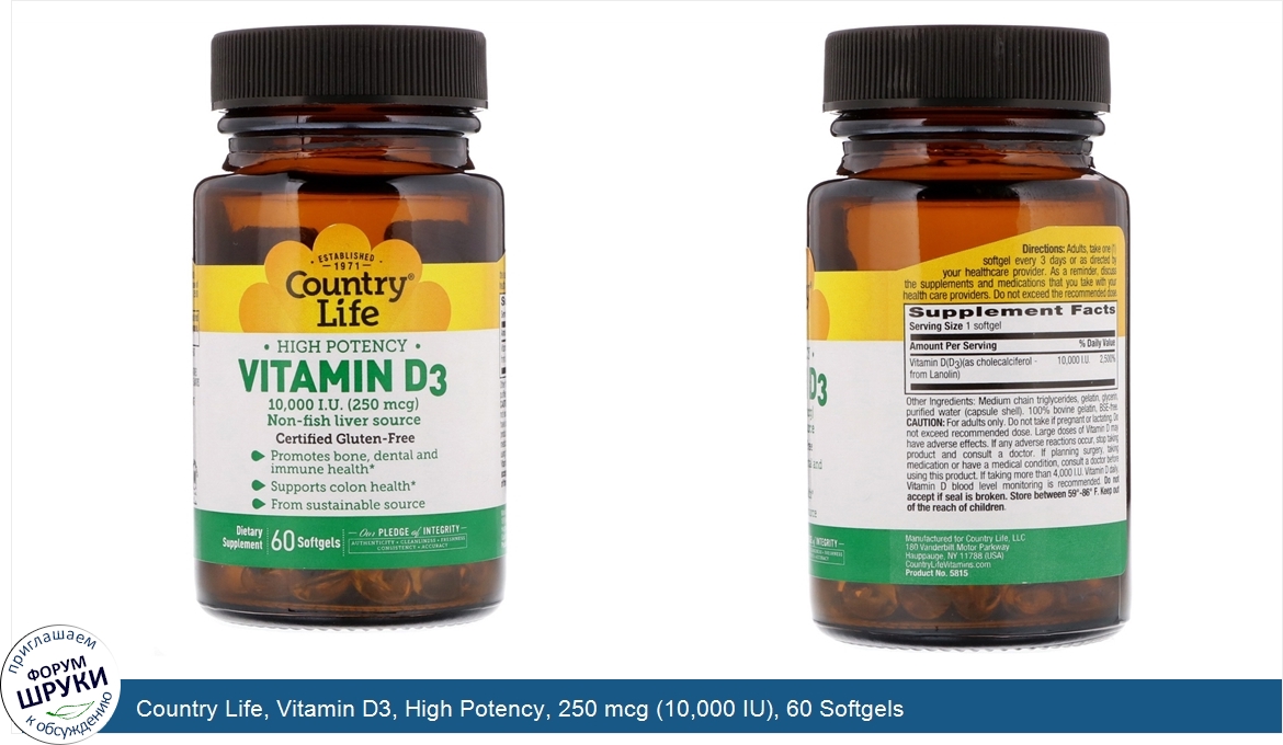 Друзья, если у вас есть отзыв/дополнение/комментарий/вопрос относительно Country Life, Vitamin D3, High Potency, 250 mcg (10,000 IU), 60 Softgels - напишите его ответом в эту тему (это будет полезно всему сообществу в целом и вам в отдельности).