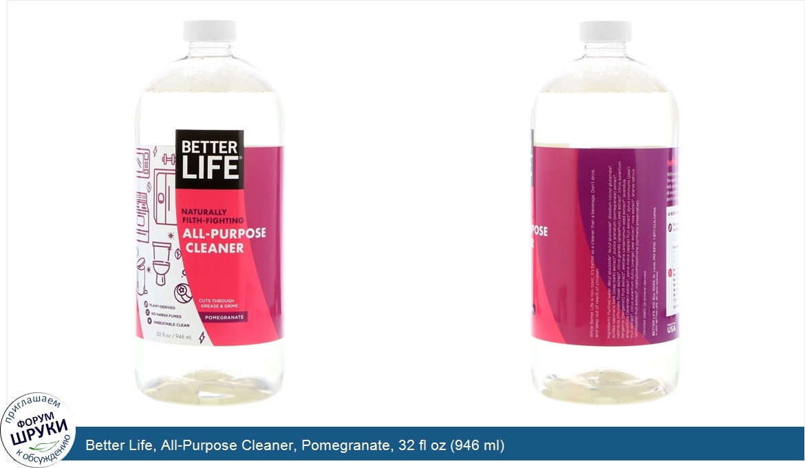 Друзья, если у вас есть отзыв/дополнение/комментарий/вопрос относительно Better Life, All-Purpose Cleaner, Pomegranate, 32 fl oz (946 ml) - напишите его ответом в эту тему (это будет полезно всему сообществу в целом и вам в отдельности).