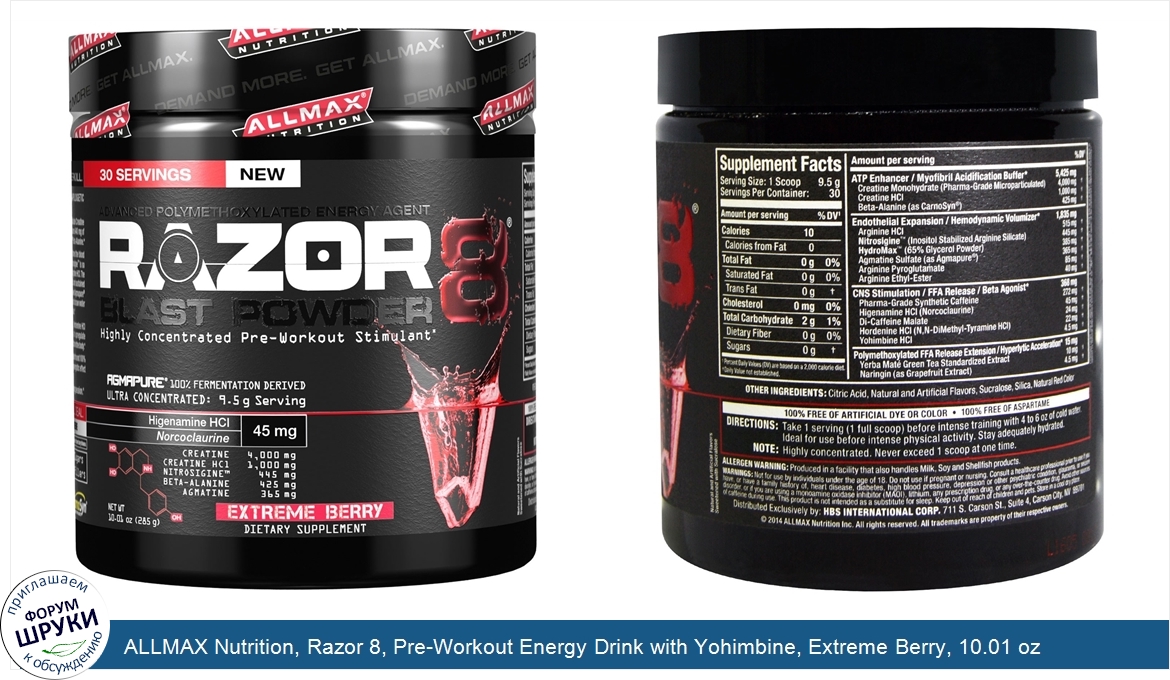 Друзья, если у вас есть отзыв/дополнение/комментарий/вопрос относительно ALLMAX Nutrition, Razor 8, Pre-Workout Energy Drink with Yohimbine, Extreme Berry, 10.01 oz (285 g) - напишите его ответом в эту тему (это будет полезно всему сообществу в целом и вам в отдельности).