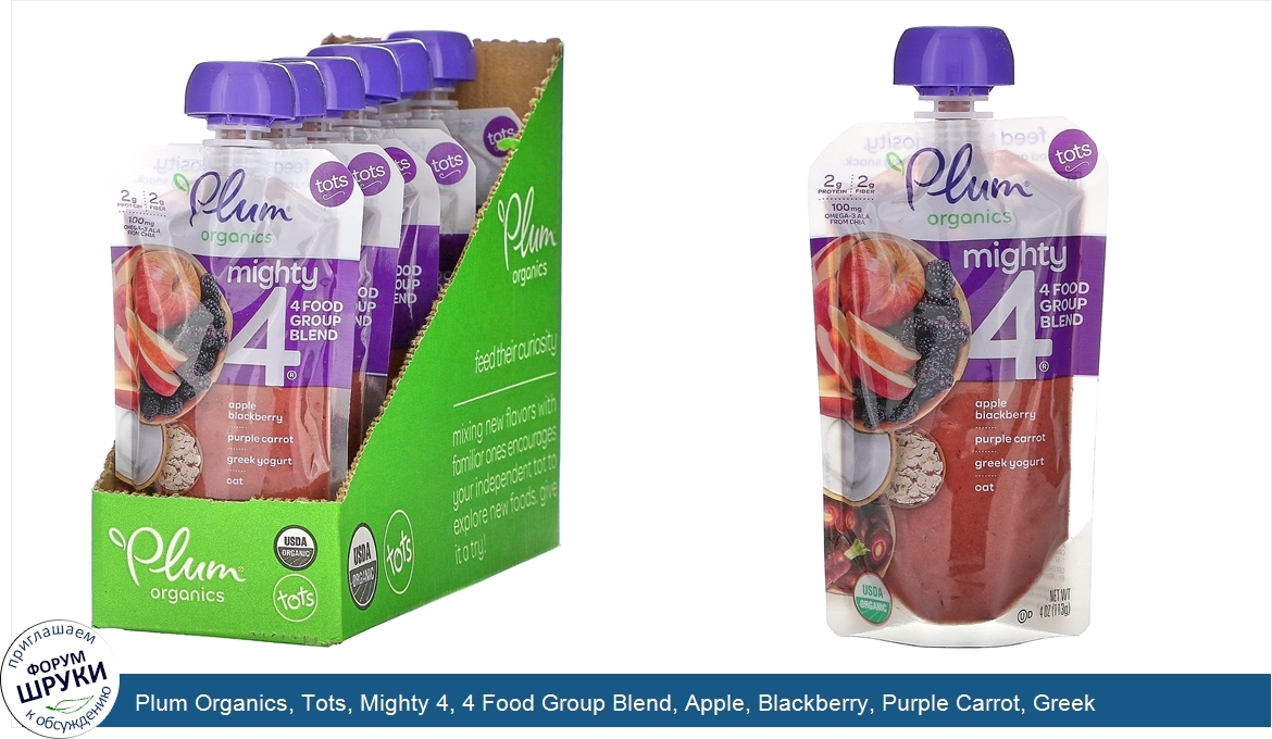 Друзья, если у вас есть отзыв/дополнение/комментарий/вопрос относительно Plum Organics, Tots, Mighty 4, 4 Food Group Blend, Apple, Blackberry, Purple Carrot, Greek Yogurt, Oat, 6 Pouches, 4 oz (113 g) Each - напишите его ответом в эту тему (это будет полезно всему сообществу в целом и вам в отдельности).
