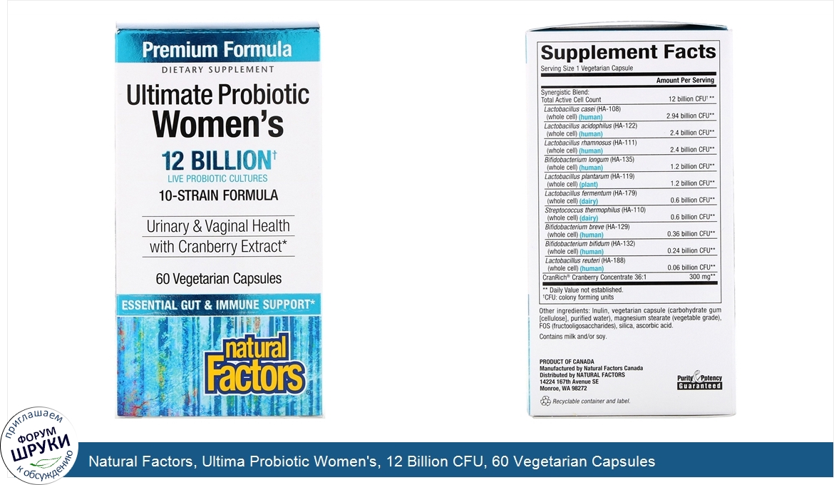 [DESCRIPT]Leaders in Probiotic Science Innovation with Over 35 Years' Experience. Premium Formula. Dietary Supplement. 12 Billion† Live Probiotic Cultures. 10-Strain Formula. Urinary Vaginal Health with Cranberry Extract. Essential Gut Immune Support. Suitable for Vegetarians. Purity Potency Guaranteed. Why Choose Ultimate Probiotic? The Ultimate Probiotic family is the culmination of over 35 years of research and formulation expertise. Ultimate Probiotic Women's provides targeted support for urinary, vaginal, intestinal, and immune health. Research - Supported strains strengths. Potency guaranteed through expiration. Guaranteed compatibility ensures viability. Bio-Support technology for guaranteed acid resistance. Beneficial prebiotic fiber. DNA mapping of each strain for guaranteed identity. Gluten Free. An imbalance in gut flora may be caused by stress, diet, travel, gastrointestinal disturbances, and medication use. Ultimate Probiotic Women’s contains a blend of only the most powerful bacteria strains that work synergistically for maximum activity and efficacy to support intestinal, vaginal, and urinary tract health. Supporting a positive balance of microflora also helps maintain a healthy immune system and digestive strength. A healthy intestinal flora helps to create a favorable environment for absorption of nutrients. The formula also contains CranRich for additional urinary tract and vaginal support. Enteric coating is not required for all probiotic strains. With regard to stomach acid resistance, not all strains are created equal. Natural Factors has carefully selected naturally acid-resistant strains so that they may be consumed at any time, with or without meals, and are safely delivered to the intestine unharmed. Our strains are tested for their viability in the stomach to ensure optimal absorption and efficacy. †Guaranteed minimum 12 billion active cells per capsule at expiry date. †Guaranteed minimum 21 billion active cells per capsule at manufacture date. Isura:. Non-GMO: Documentation ✔. Mass Spec: Lab Tested ✔.[/DESCRIPT]... (описание дополняется)