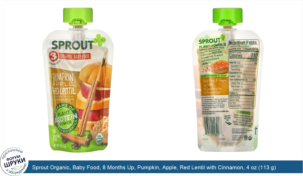 [DESCRIPT]Stage 3. 3 Grams of Plant Powered Protein from Red Lentils. Kosher. Gluten Free. USDA Organic. 100% BPA-Free Packaging. Certified Organic by QAI. Certified Organic by Quality Assurance International. Sprout Plant-Powered purees are made with organic red lentils, a delicious protein-alternative to meat and dairy based products. Sprout is committed to:. Dairy-Free Vegan. Non-GMO. No Concentrates. No Preservatives.[/DESCRIPT]... (описание дополняется)