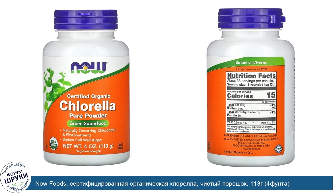 ru Now Foods, сертифицированная органическая хлорелла, чистый порошок, 113г (4фунта)
