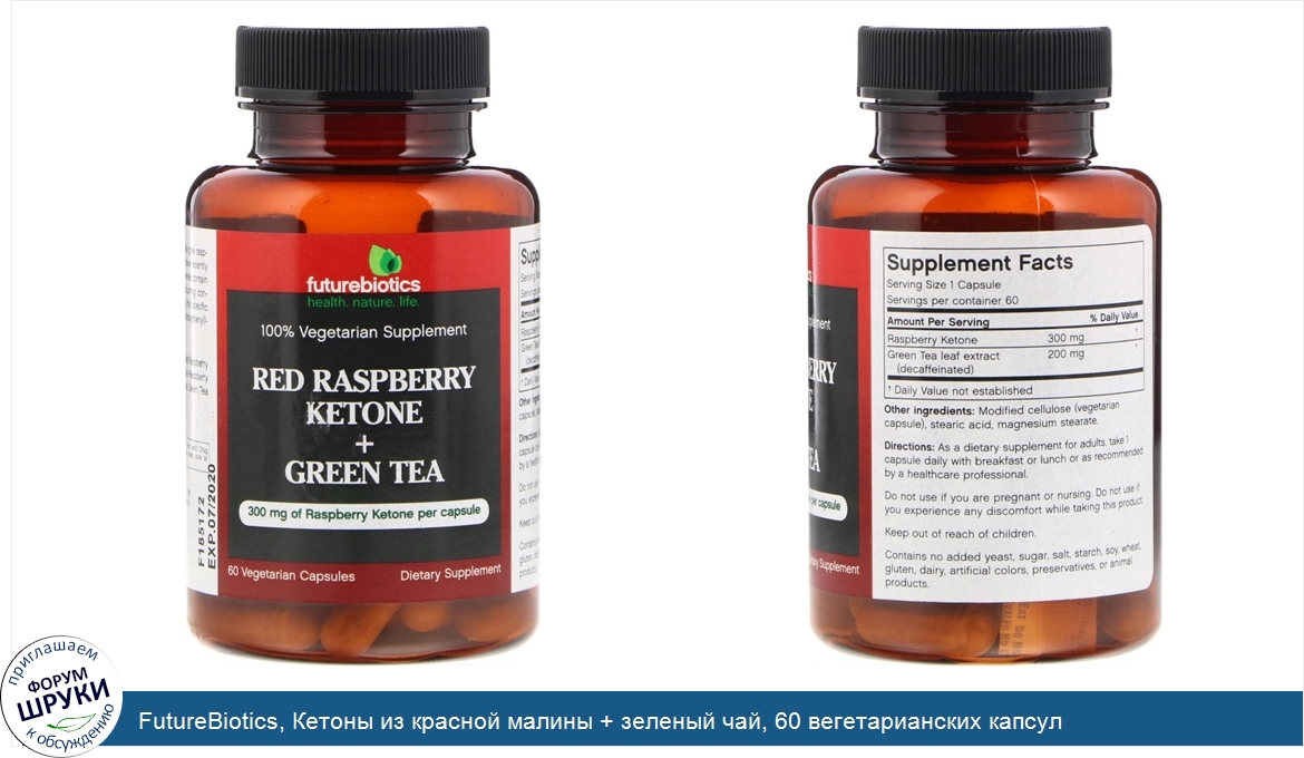 [DESCRIPT]BPA Free Plastic Bottle. Health. Nature. Life. 100% Vegetarian Supplement. 300 mg of Raspberry Ketone Per Capsule. Dietary Supplement. Raspberry ketones are unique compounds that give raspberries their distinctive aroma. Researchers have recently determined that like many other fruits, raspberries contain a number of biologically active, naturally-occurring constituents beneficial to good health, including this specific ketone that is unique to raspberries: 4-(4-hydroxyphenyl)-2-butanone. Each vegetarian capsule of FutureBiotics Red Raspberry Ketone + Green Tea provides 300 mg of pure Raspberry Ketone, along with 200 mg of decaffeinated Green Tea extract.[/DESCRIPT]... (описание дополняется)