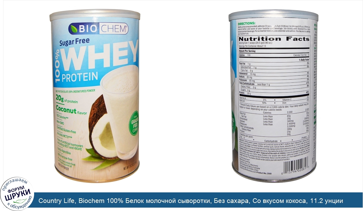 Друзья, если у вас есть отзыв/дополнение/комментарий/вопрос относительно Country Life, Biochem 100% Белок молочной сыворотки, Без сахара, Со вкусом кокоса, 11.2 унции (319 г) - напишите его ответом в эту тему (это будет полезно всему сообществу в целом и вам в отдельности).